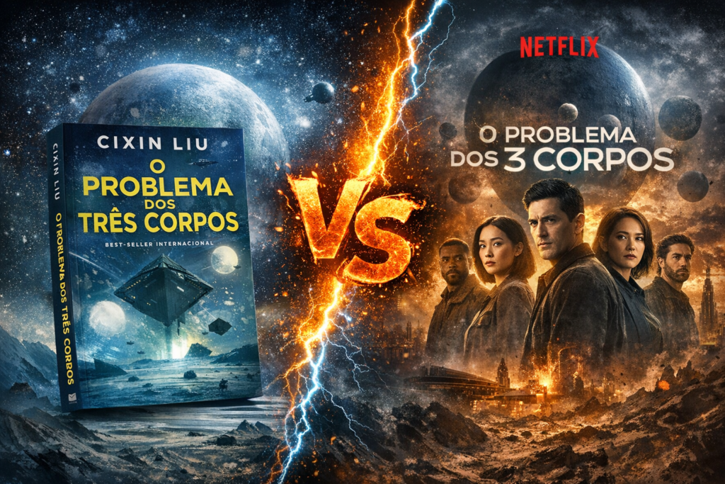 Na série tudo começa na China e tem seguimento nos Estados Unidos, já no livro, escrito pelo chinês Cixin Liu, toda a trama se passa na China, tendo a maioria de seus personagens chineses, o ponto que mais pegou em relação a série, é que no livro eles não mostram muito romance, os personagens têm uma construção mais sólida quanto suas emoções, mas o que esperar da adaptação da Netflix para série americana, não é algo que me incomoda, até passei a ler o livro a partir da série, acredito que para prender mais o público é preciso usar a melhor ferramenta de venda, sexo… sexo vende né? Mas ao ler o livro dá pra sentir mais profundidade nos personagens as emoções mais intensas que a trama exige.